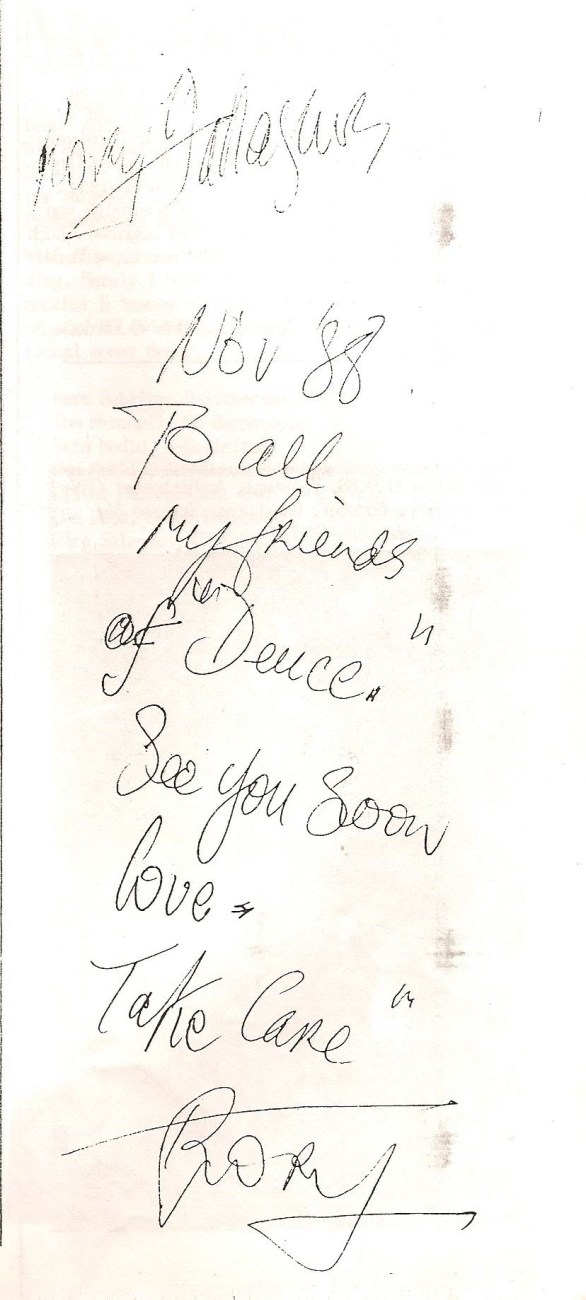 Folkestone on 28th November 1988 was a completely different experience. There were only about 500 fans at the most. However, there was little atmosphere in the hall. The sound wasn’t that good either. The Right Stuff were again Rory’s guests, but they couldn’t persuade us. He played almost the same songs as in London, but only did one encore, which is very unusual. But at last, we could meet him afterwards and that was our aim. The photograph, which Rory signed especially to all the Deuce members, was also taken during the Folkestone concert.