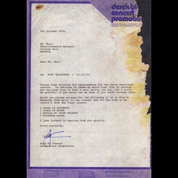 Typical of Rory’s unassuming nature, he never asked for much on his riders. In a 1987 interview with Metal Hammer, he said that “it’s nice if they can lay on a sandwich and a decent drink,” but that was all he wanted. A surviving rider from Rory’s 1974 concert at the Colston Hall in Bristol shows just one crate of Guinness, one crate of lager and one bottle of Irish whiskey, which was to be distributed among all band members, crew and fans who came backstage. It says a lot about the man and his kindness and humility.