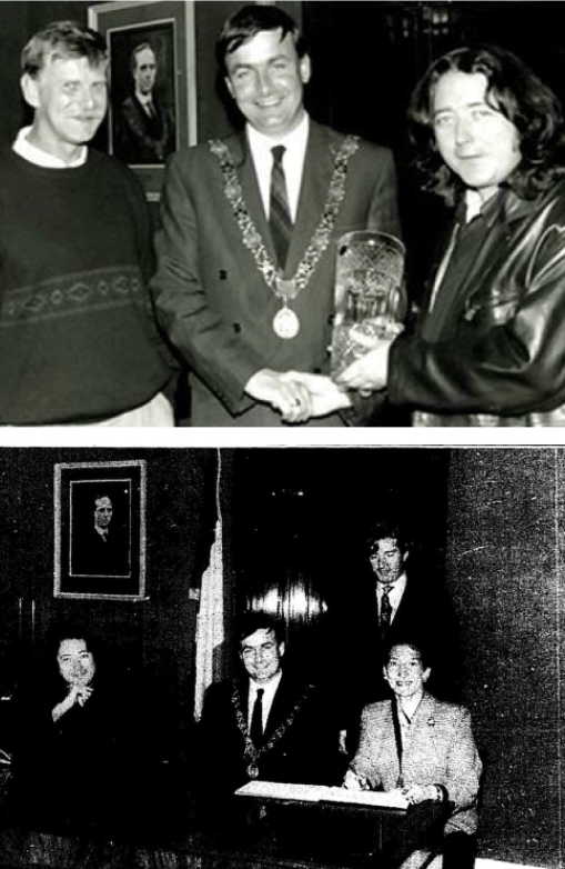 In 1992, Rory was given a civic reception with Lord Mayor of Cork Micheál Martin at Cork City Hall to celebrate his musical achievements. At the reception, he was presented with a commemorative piece of Tipperary Crystal on behalf of the city of Cork. At the ceremony, the Lord Mayor described Rory as “a world figure in his field” with a “unique” talent. He also stated that the city could be “justifiably proud” of Rory because he is “one of Cork’s greatest sons and has become part of the city’s folklore.” Such recognition came at an important time in Rory’s life when his self-esteem and confidence were low. The award was, therefore, a welcome tonic, especially coming off the back of receiving the Arbiter/Fender Hall of Fame award just two weeks before at his Guinness Hopstore masterclass.