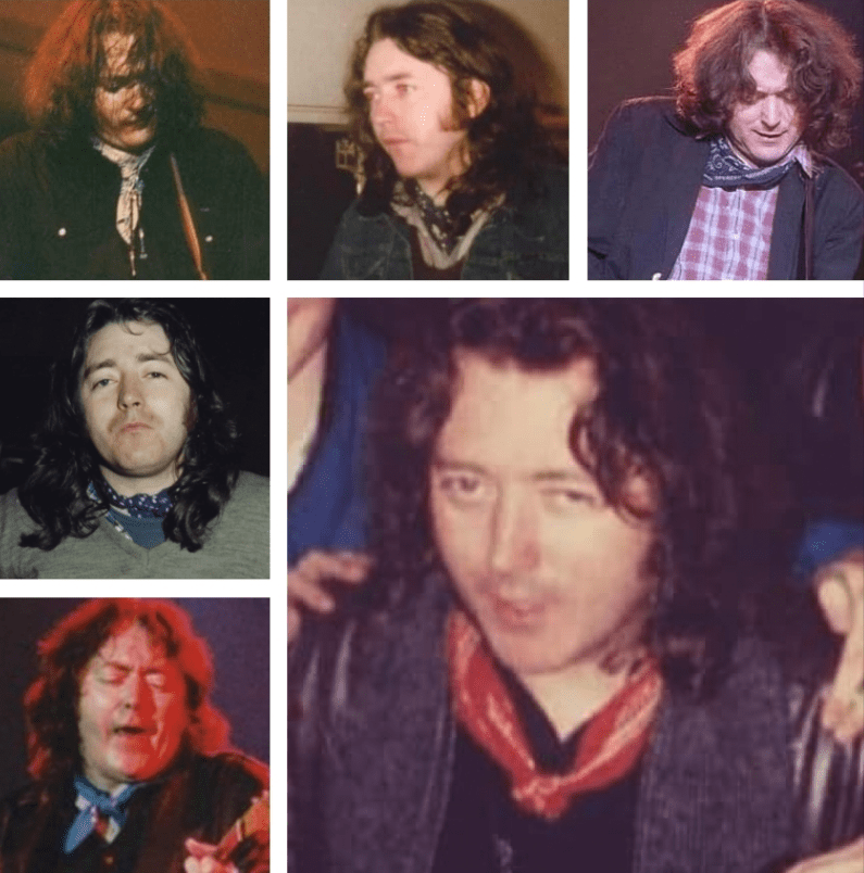 Yet another part of Rory’s Western image was his neckerchiefs – something he could often be seen wearing from 1977 onwards. Even as a child though, inspired by Gene Autry and Roy Rogers, he wore them. Rory’s schoolfriend Billy Barry recalls him participating in local talent shows, dressed in a lumberjack shirt, blue jeans, neckerchief and cowboy hat. For fan Kicki Söderström, Rory’s neckerchiefs seemed to “somehow give him comfort.” Claudia Debianchi likes how he used to wear them originally hiding the knots and matching different shirt patterns, wearing them tight on his neck in the 1970s and rather loose in the 1980s and 1990s.